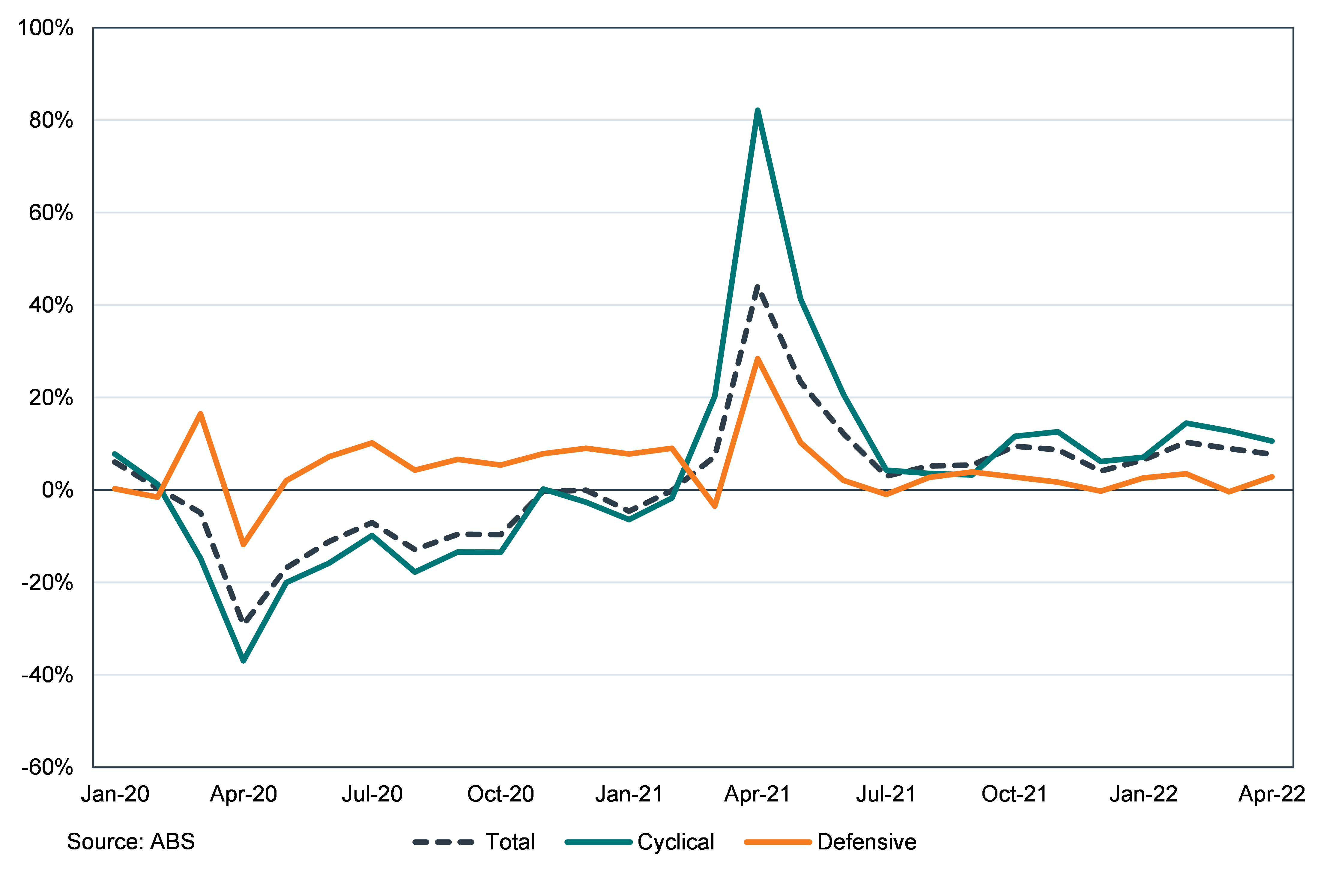 Retail trade remained sold in April, underpinned by turnover at cafes, restaurants and takeaway food outlets (19% higher than pre-pandemic levels). |