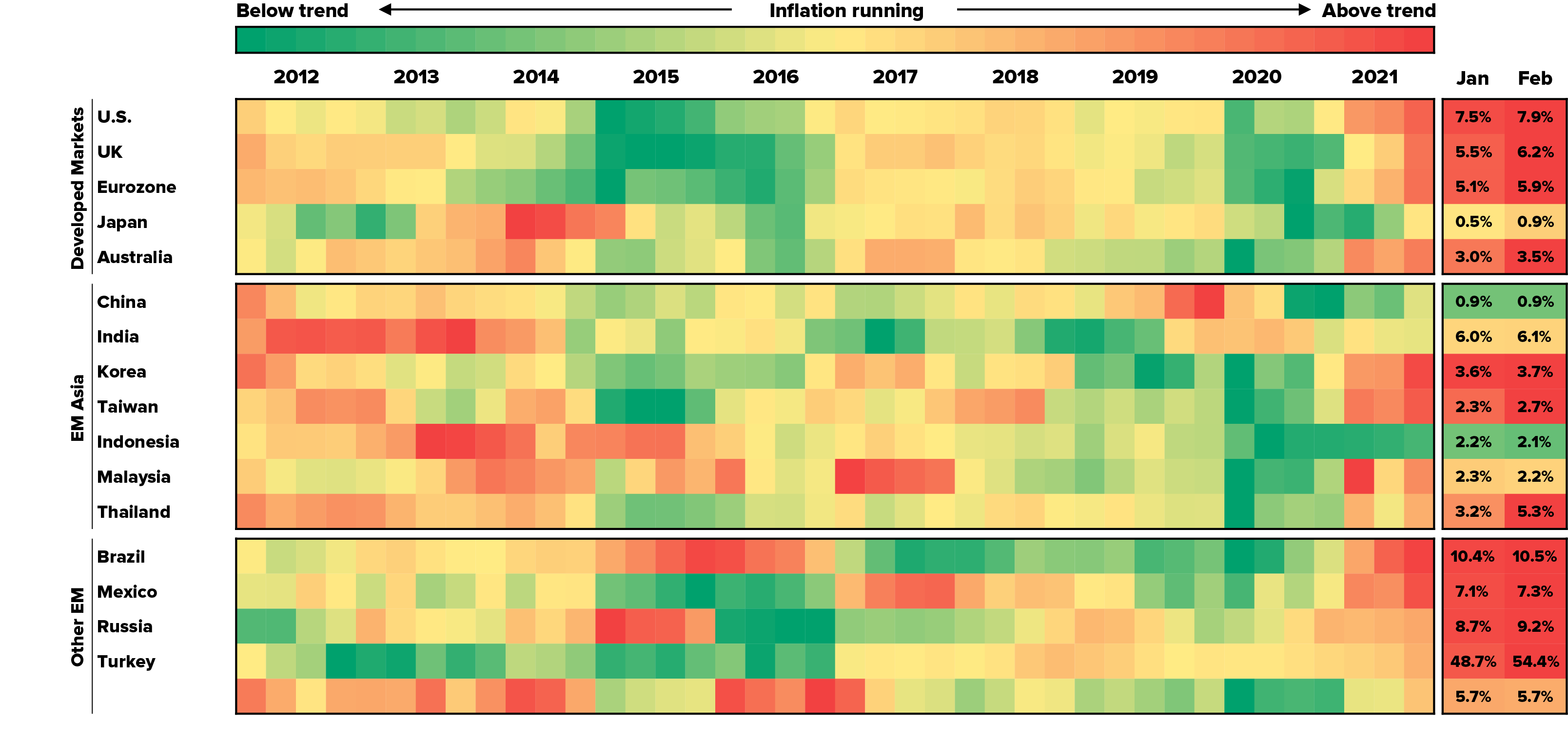 | Inflation | Surging inflation driven by higher commodity prices, supply chain bottlenecks and rising wages. China’s deflationary pressures reverse as it is forced to import inflation from its trading partners.