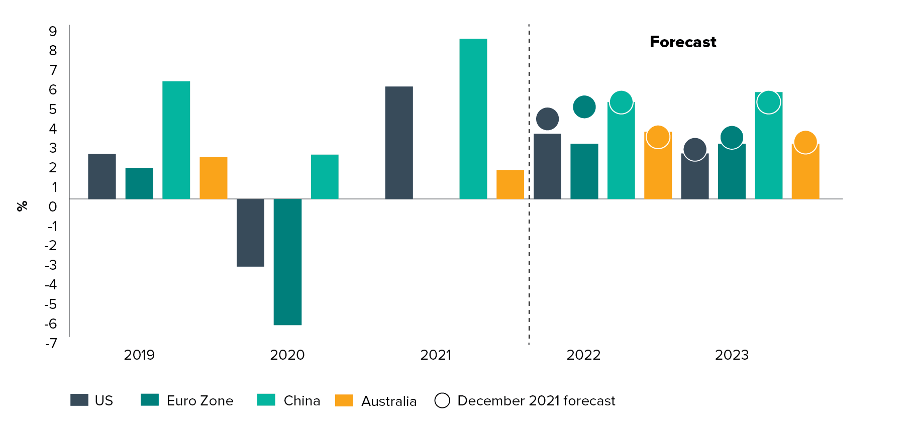 | Growth | Clear deceleration of activity while inflation remains elevated and uncontrolled, especially within the U.S and Europe. Recessionary fears build while stagflationary pressures begin to loom large over Europe. China’s zero covid policy results in a big miss on GDP target. | Global activity to remain above trend, but below optimistic forecasts struck at the beginning of the year, with a greater deceleration to be witnessed in 2023. Supply chain and labour bottlenecks will remain in play for much of this year. Consumption to ease as cost of living pressures remain elevated. | 2 x trend growth rates delivered across much of the developed world, buoyed by strong consumer and business confience.