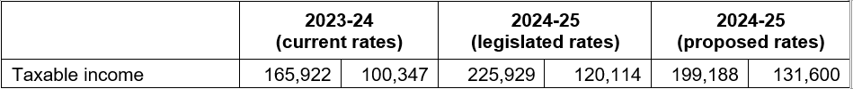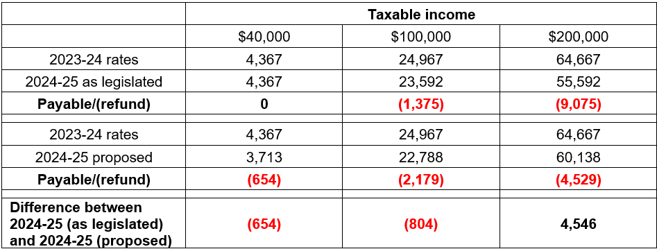 The following table summarises the current rates (i.e. 2023-24), the stage 3 rates as legislated and those proposed by the government for 2024-25.
