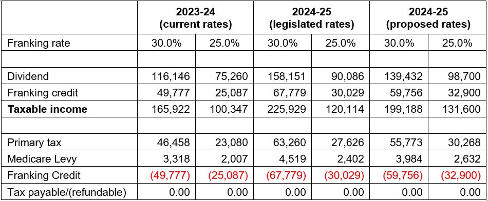 Two preliminary matters to note before looking at the impact for an individual receiving a franked dividend. First, does the company have sufficient profits to be able to pay a franked dividend? Second, whether the maximum franking credit will be set having regard to the 25% or the 30% company tax rate.