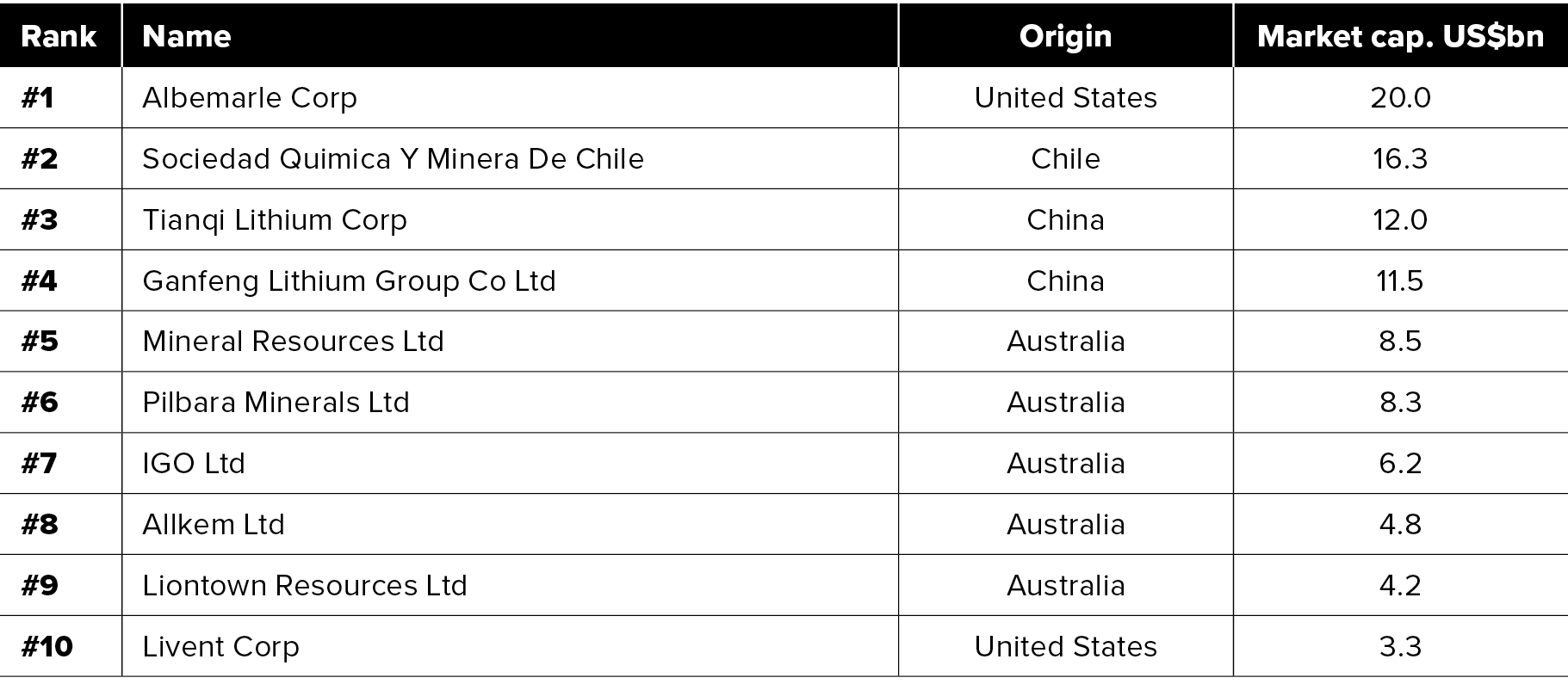 The world’s largest lithium producer, Albemarle Corporation, operates a Chilean lithium mine in partnership with the second biggest producer, Sociedad Química y Minera de Chile (SQM). In turn, SQM is a joint venture partner of Wesfarmers Ltd (ASX: WES) in the development of the $1.9bn Mt Holland lithium project in WA. Albemarle also has assets in the US and Australia via its 50/50 partnership with Mineral Resources (ASX: MIN) Wodgina lithium mine. Albemarle has only recently bid A$6.6bn for another lithium player in WA – Liontown Resources (ASX: LTR). As part of the country’s efforts to dominate the clean energy metals supply chain, three Chinese companies are also among the top lithium companies. The biggest, Tianqi Lithium, has a significant stake in the Greenbushes mine in WA along with its partner Albemarle and IGO Ltd (ASX: IGO), which is currently the world’s largest and highest-grade source of hard-rock lithium.
