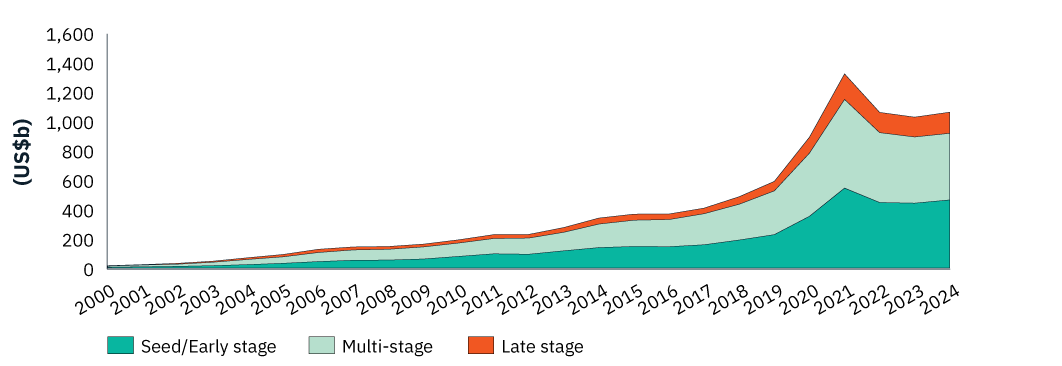 Artificial intelligence has become the defining theme. Nearly half of all global VC investment dollars in 2024 flowed into AI startups, with mega-rounds and surging valuations for category leaders (Open AI US$300bn, Anthropic US$61.5bn). Investors see AI as the engine for the next decade’s innovation, akin to being the next ‘industrial revolution’, reflecting the immense opportunity set.