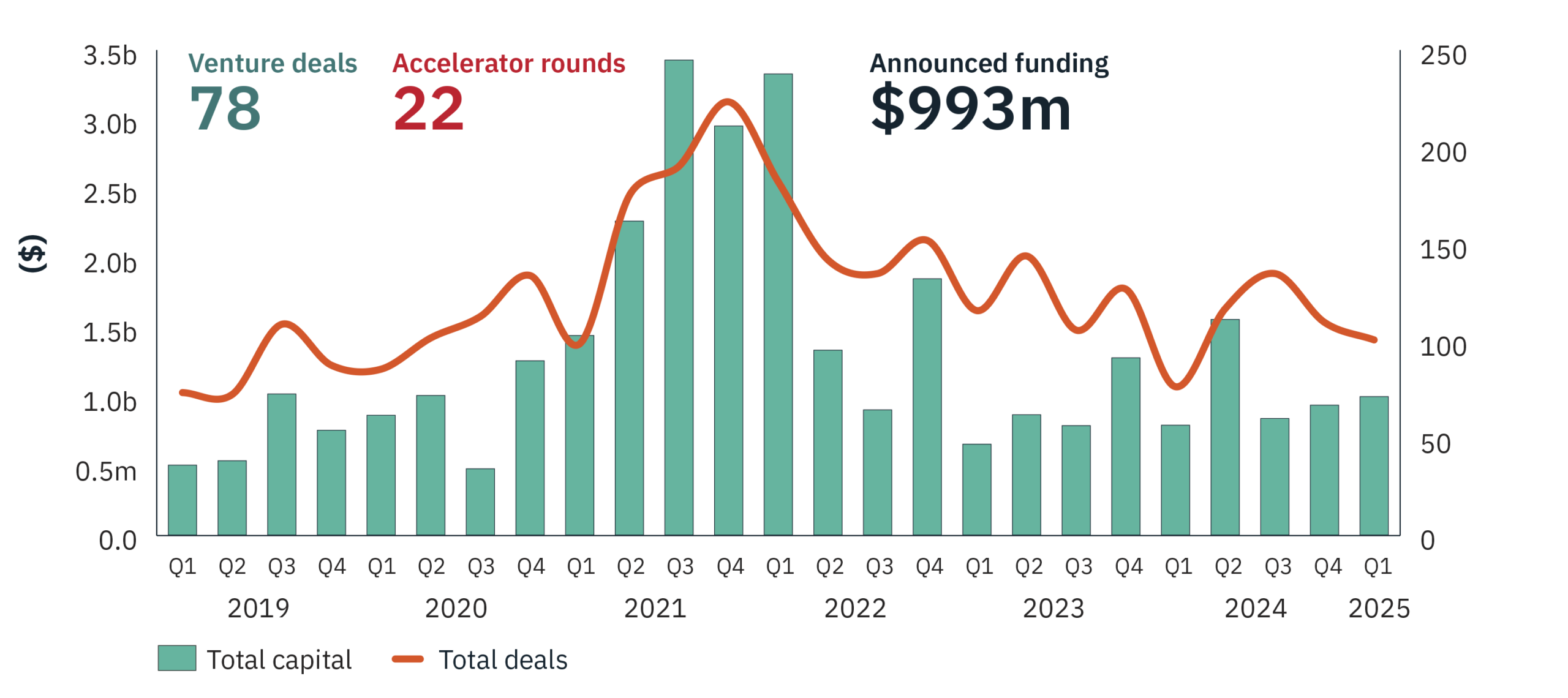 The AI Effect and sector shifts. The global AI boom is making waves locally too. Australian startups in AI, deep tech, and climate tech saw capital raising lift in Q1 ’25 to the highest level since 2022, across 100 individual deals (Source: Cutthrough Venture). Australian startups continues to attract a growing share of global capital. Several high profile deals have bypassed local VC managers entirely, yet the number of locally funded deals is still growing. Capital allocation from fund managers we have spoken to recently continues to be quite discerning around strong fundamentals and operational resilience, with any ‘unproven’ concept opportunities attracting very low levels of investment.