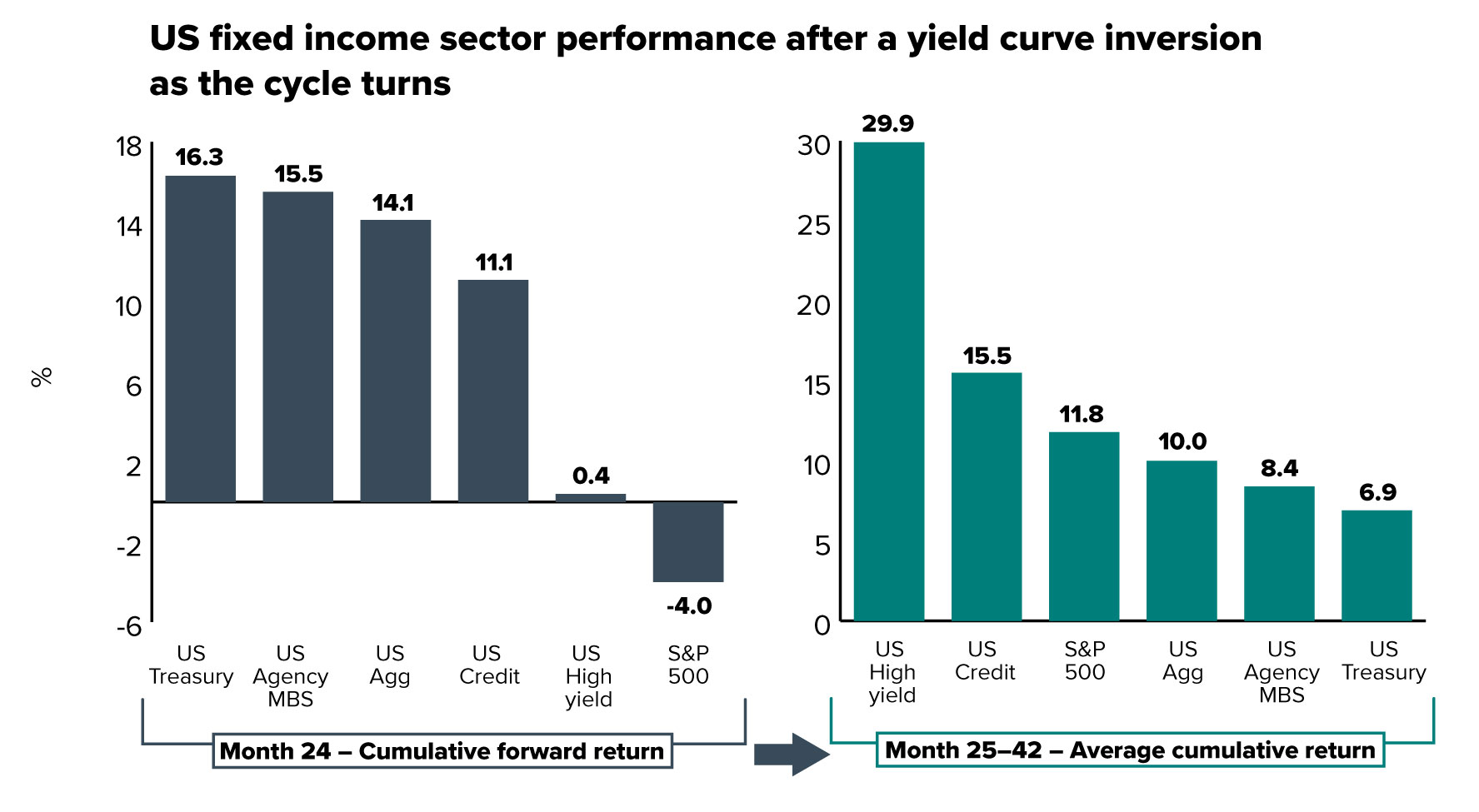 While every monetary cycle can produce various outcomes on the performance of each asset class, the below historical sector performance in the US, following the peak of each monetary cycle, can be used as a guide. It essentially shows that bonds outperform the rest of the sectors in the first 24 months after a yield curve inversion, largely benefiting from the appreciation in bond prices as the cash rate is cut lower in order to support the economy.